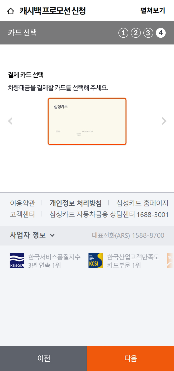 - 다이렉트 오토 이용 시, 삼성카드의 발급 행사 혜택(연회비 캐시백, 포인트/마일리지 적립, 쿠폰 등) 및 이용유도 행사 혜택(캐시백, 포인트/마일리지 적립, 쿠폰 등)에서 제외될 수 있음